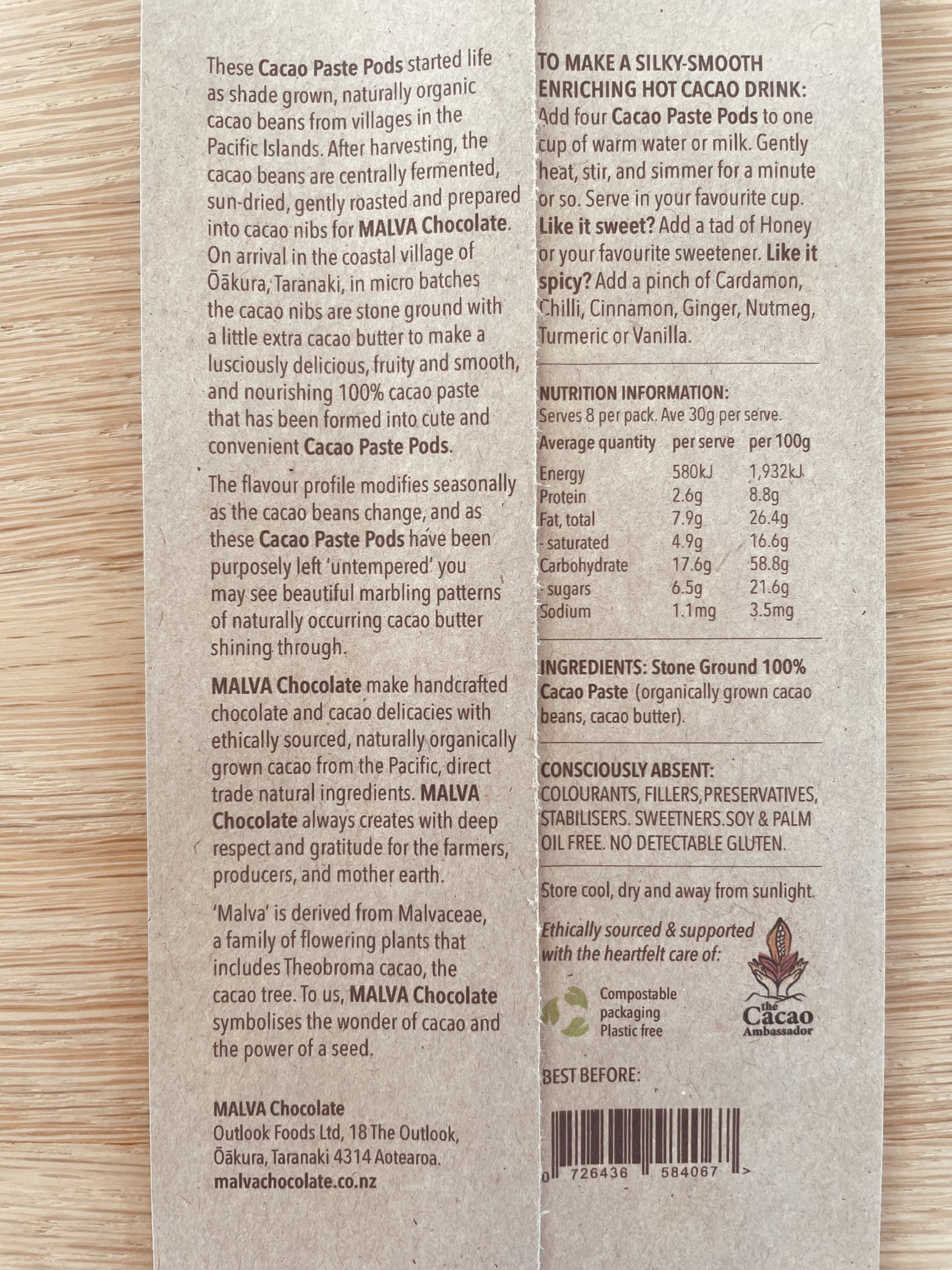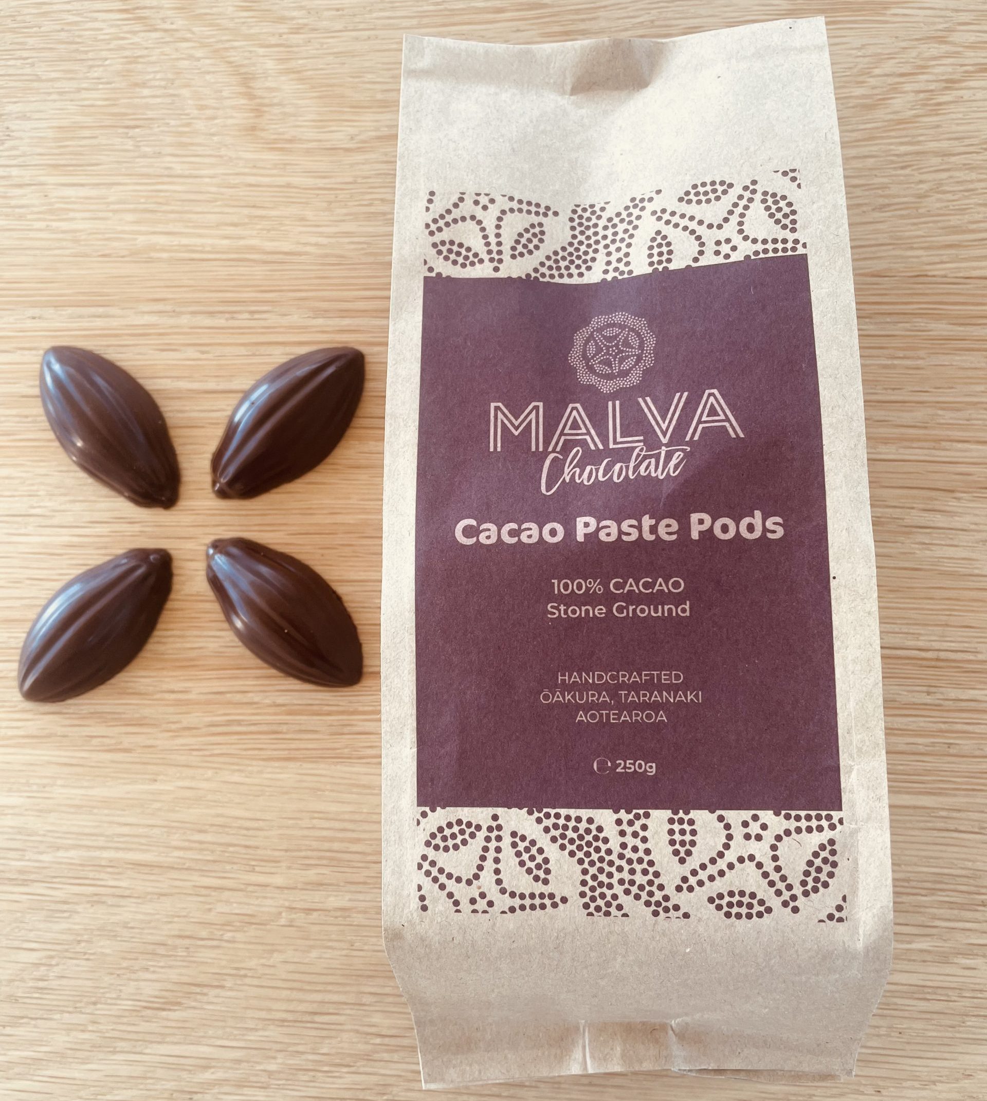 These Cacao Paste Pods started life as shade grown, naturally organic cacao beans from villages in the Pacific Islands. After harvesting, the cacao beans are centrally fermented, sun-dried, gently roasted and prepared into cacao nibs for MALVA Chocolate. On arrival in the coastal village of Ōākura, Taranaki, in micro batches the cacao nibs are stone ground with a little extra cacao butter to make a lusciously delicious, fruity and smooth, and nourishing 100% cacao paste that has been formed into cute and convenient Cacao Paste Pods.